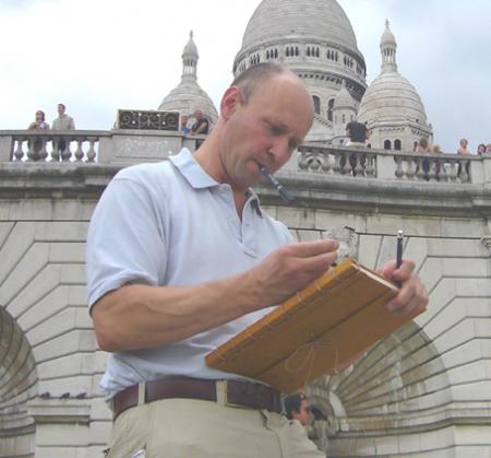 « J'ai eu le plaisir de passer une semaine de stage artistique à Paris . Séjournant à Montmartre , la rencontre d'un artiste , un "sans papier" appelé Zoltan , m'a permis de fréquenter des caricaturistes . La plupart se trouve dans un milieu très fermé de la Place du Tertre . Mais d'autres , croquent dans les alentours de la butte , près du Sacré Coeur . Je n'évoquerai pas trop mon hôte sympathique , maître de stage talentueux . Il vient d'un pays froid ou les caricaturistes ne sont pas appréciés du gouvernement . Un régime ou les politiques manquent d'humour...