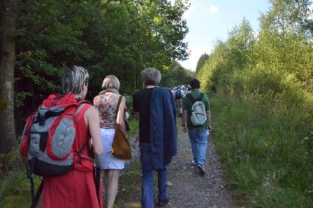La petite histoire commencerait à une terrasse ensoleillée, ce samedi 3 septembre…et ce n’est pas peu dire à ce point de l’été pluvieux et d’expression orageuse. Banc de bois rue Neuve, l’homme est attablé chez l’épicier François, il marmonne, il chantonne. Il répète me dit-il son intervention musicale pour la soirée des agapes, clôture du colloque international « Apollinaire, poète en prose » qui avait lieu ces 2 et 3 septembre à Stavelot. Des passants descendent la pente douce de la rue, venus de l’Hôtel du Mal Aimé…sans doute ont-ils réglé la note laissée par le jeune homme lors de son séjour stavelotain, « ou plutôt par la négligence ou la disette de sa mère », affirme le chanteur en répétition, « puisque Guillaume était mineur encore cet été- là ! ». « Et j’entends siffler le train » hèle-t-il, le chanteur en casquette et pipe fumante, à l’adresse des passants. En effet le départ de ce rendez- vous insolite est sur l’esplanade devant l’abbaye : le petit train touristique de la ville acheminera les spectateurs- voyageurs. Les passants ne sont autre que les Amis de Guillaume venus d’ailleurs : Paris, France, Allemagne, j’entends aussi la langue anglaise, j’entends chanter la langue italienne. La bonne humeur sifflote et pète dans les rues de Stavelot, la bonne humeur est dans le cœur des amis du poète ! Départ imminent et avancé du petit train, pour la bonne raison du cœur : deux jeunes mariés vont emprunter les banquettes du même petit train pour un premier voyage de noce ! Destination première de la tribu des marcheurs : arrêt le long de la Haute Levée, suivez les guides attentives ! Marcher dans ce souffle quasi naissant de douceur solaire. A la croisée de deux chemins, un corps de femme au loin se démarque, vient à notre rencontre. De noir vêtue et bottines de marche. Entre réflexions de linguiste sur la chanson de geste, la défiance des aoûtats protégée par de hautes bottes et les appels gourmands des cèpes de Bordeaux, une voix s’élève : « Que deviendra mon cœur parmi ceux qui s’entr’aiment… » La voix, d’entrée de jeu poétique, m’a prise à la gorge, une émotion intense me fouette le visage comme une branche solidement enracinée. Il me souvient de ce « petit » corps de femme, la première fois, il y a des années, au Festival Voix de Femmes à Liège, au Cirque des Variétés. Je disais alors à mon voisin d’écoute : « dis, d’où vient-il cet étrange son ? » Et lui joyeusement de me surprendre : « eh bien ! du corps de femme devant toi ! Fanchon Daemers. Je retrouve à la croisée des chemins des bois à Stavelot cette émotion première. Elle avance et prends le chemin de l’autre côté, nous la suivons dans cet au- delà. « Je compose généralement en marchant et en chantant sur deux ou trois airs qui me sont venus naturellement. » disait le poète. C’est à cette invitation du rythme des pieds que l’artiste Fanchon nous convie. Un éventail de poèmes et de proses poétiques évoquent la relation intime qui reliait Apollinaire et la nature, sous les traits de la forêt des Ardennes. Dans les Ardennes de Belgique, un pied frôle un champignon, une bouche dévore une mûre tout juste trouvée, une sonnerie de téléphone résonne… d’anachronisme ! Les spectateurs retiennent leur souffle puis le silence devient caisse de résonnance aux mots du poème et à la voix de l’artiste en Herbe ! Arbres, sources et champignons déclinent leur visage dans la gamme des sonorités puissantes et fragiles que Fanchon Daemers fait éclore du plus profond d‘elle- même. Voix parlée, voix chantée s’alternent au gré des stations du paysage. Une scénographie superbement choisie par Fanchon, dans laquelle chaque spectateur viendra inscrire son propre angle de vue. Un spectacle d’une intelligence et d’une sensibilité parfaite. Un face à face avec des drèves élancées, une provocation dansée dans les hanches de l’artiste qui abritent des sons majestueux. Je retiendrai aussi l’assaut des guêpes sur le tissu tigré du vêtement de cette Amie spécialiste de Guillaume, Elle qui a procuré à Fanchon « les conseils scientifiques » : Claude Debon ! La bruyère se promène à la boutonnière de l’auditeur. A un arrêt, imprévisible « embuscade » : une collation : la tarte de la région : le waution et…la bouteille de pékêt délivrée par les soins personnels de l’artiste André Stas. Clin d’œil et conseil : la meilleure est de Flandres selon lui ! Un bon coup de pouce pour entonner ensemble la suite de la balade par un crâmignon chanté et cocasse. Les airelles font les dos se baisser et le plaisir du palais de quelque étranger. La valeur ajoutée de la balade-spectacle pour moi est, il est vrai, la présence d’accents venus d’ailleurs, l’étendue du paysage qui écoute et reçoit de plein fouet la générosité de Fanchon et les vers du poète. J’ai même imaginé que viendrait répondre à l’écho des amours de Apollinaire et Marèye du temps passé le défilé des mariés du jour à Stavelot ! Dans les bois ou sur la fagne de Bellaire. Un moment magique voit Fanchon enlacée dans les racines d’un arbre effondré. Cathédrale du cercle de terre et de bois d’où surgit « l’Ermite » du poète. Chaque spectateur a isolé son écoute dans une position, assise qui le comble. « Les doigts ennamourés » dans le vers se fondent dans l’espace ici présent aux frêles troncs de sapins s’élançant dans la lumière comme main au ciel. « Je chante la joie des possibilités de moi- même…je chante la joie d’errer »… dire que le spectacle est exigent aux muscles des jambes ! qu’il dévale jusqu’à la ville de Stavelot, le temps de déguster et cuver les vers ! En passant- terminant par le faix du diable. Là où me confie le chanteur du début de l’histoire : « nous avions quinze ans, courions sur la pie