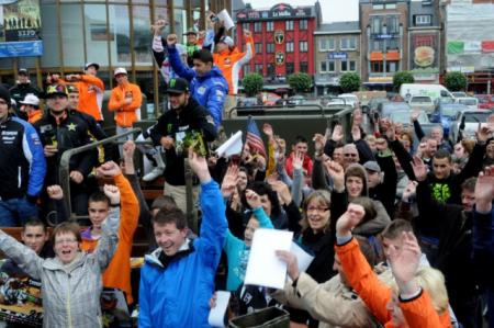 Bastogne fut envahie une fois encore, non pas par une bataille, mais bien par des teams. Ce week-end du 15 au 17 mai, Bastogne accueille une manche du championnat du monde de moto cross mx1 et mx2. C’est sur le site de "sans soucis" que se déroule cet événement. Pour commencer cette journée du 15, qui était une journée libre pour nos pilotes, un convoi de vieux véhicules de l'armée amériquaine nous conduit alors, du site des "sans souci" jusqu'au centre de Bastogne, ou nous avons eu l’occasion de découvrir un Show Freestyle de Trial par Frédéric Crosset. Nous avons pu assisté à une séance d’autographes et nous avons pu photographier nos pilotes. Le tous se fit sur la place Mc Auliffe dans une très bonne ambience. Beaucoup de personnes avaient fait le déplacement pour l’événement.