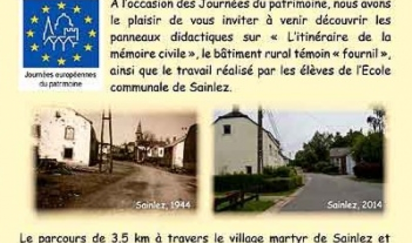 Dans le cadre des journées du Patrimoine, le village de Sainlez (Fauvillers) vous invite à découvrir son "Itinéraire de la mémoire civile" et un bâtiment rural restauré. Le parcours jalonné de panneaux est dédié aux 2500 civils qui ont perdu la vie en 1944-45 au cours de la bataille des Ardennes.