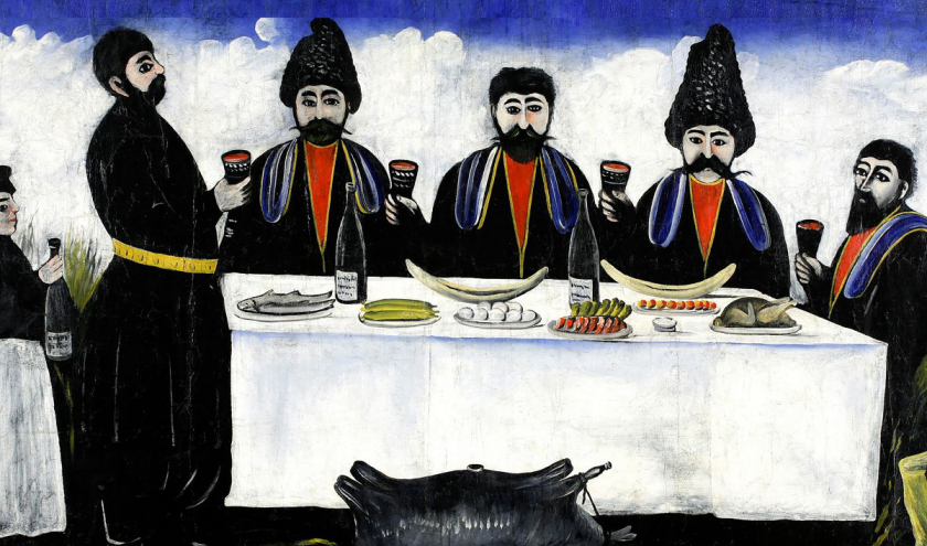 Au sein de l’une des salles, consacrée à Niko Pirosmani (1862-1918), une peinture de grandes dimensions attire notre attention, célébrant l’un des piliers de la culture sociale géorgienne, le « supra » (« nappe », en français), un banquet traditionnel, agrémenté de mets et de vins géorgiens, sachant que les premières traces de viticulture et de vinification, en Géorgie, datent d’il y a 8.000 ans, des découvertes archéologiques amenant les historiens à considérer ce pays comme étant le berceau mondial de la vigne domestiquée et du vin.
