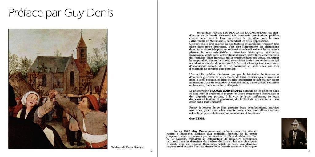 En suivant les 45 fanfares, harmonies, ou élégantes philharmonies, toutes sympathiques, qui peuplent la province de Luxembourg, découvrons avec le photographe-conteur Francis Cornerote, et le romancier Guy Denis, un morceau de notre patrimoine culturel vivant. A travers les nombreuses