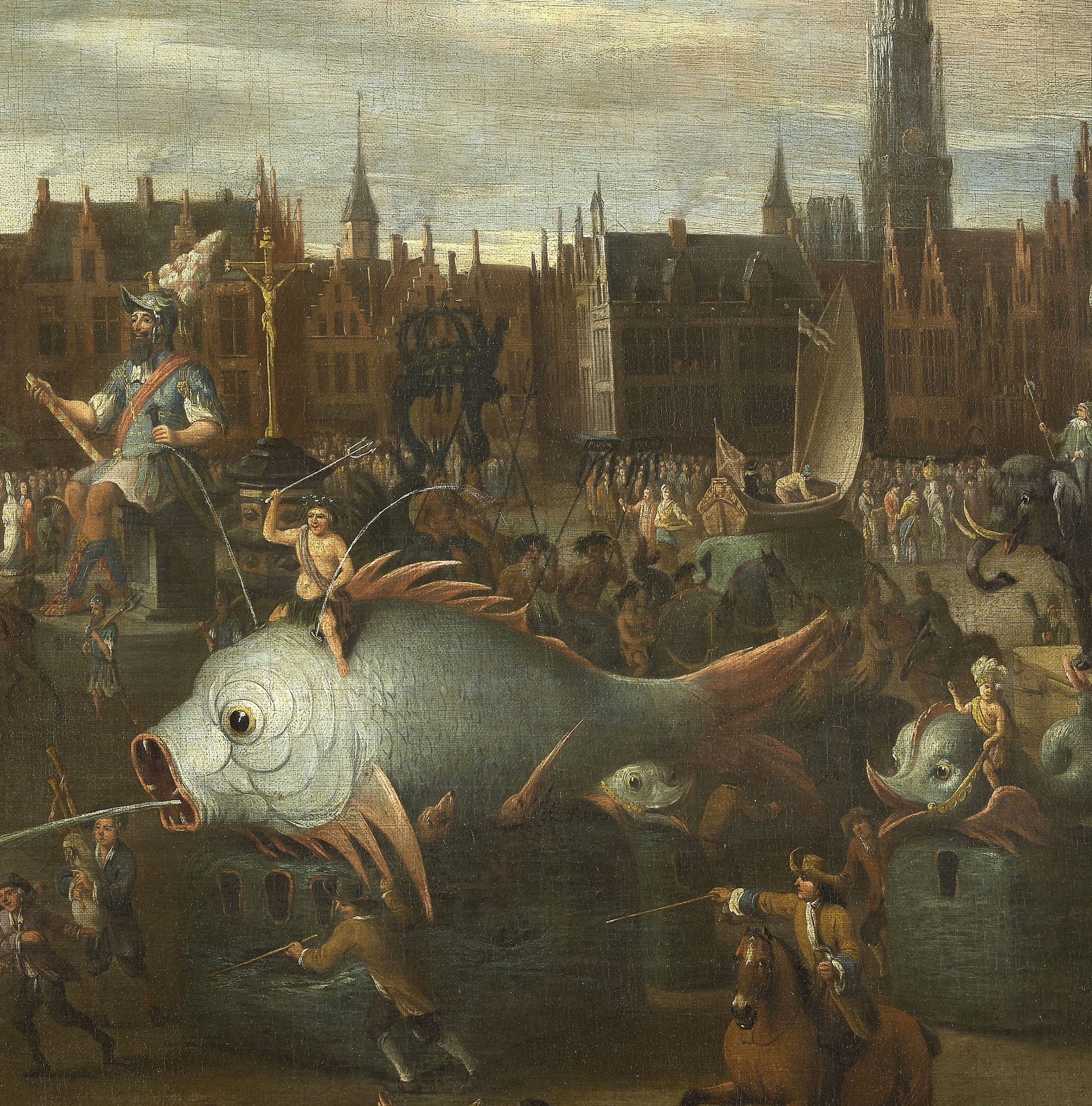 Soulignons la présence de deux têtes de géants, en papier mâché, bois, métal & cheveux, d »une hauteur d’1m84, celles de Pallas Athena (1765-1766), d’après Daniel Herreyns (?-1809) et de Druon Antigone (1534-1535), d’après Pieter Coecke van Aelst (1502-1550), un géant que nous retrouvons dans l’huile sur toile « Fête traditionnelle à Anvers avec le Géant Druon Antigon » (1697), du peintre anversois Alexander van Bredael (1663-1720).