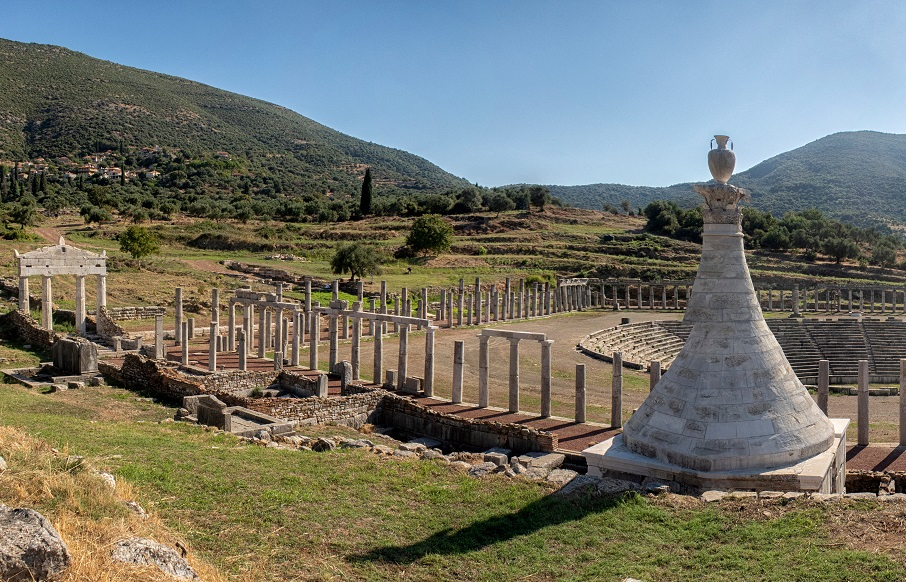 C’est au dieu Esculape qu’un temple a été édifié à Ithomi. S’asseoir sur les gradins du théâtre qui ouvre sur une scène tapissée de dalles de marbre polychromes ou encore sur les degrés en fer à cheval qui encadrent le stade, c’est s’offrir une merveilleuse incursion dans le passé. Au cœur de cette vallée riante ombragée par des oliviers centenaires, l’imagination se laisse emporter pour vagabonder à l’époque où le général Epaminondas édifiât ici une ville prospère pour stopper l’expansionnisme de Sparte. Pour protéger la cité, il construisit une gigantesque muraille qui serpentait entre la plaine et la montagne en épousant les moindres contours du relief. Aujourd’hui encore, la route emprunte la monumentale porte d’Arcadie dont l’appareillage des murs de type cyclopéen stupéfie le visiteur.