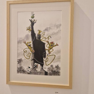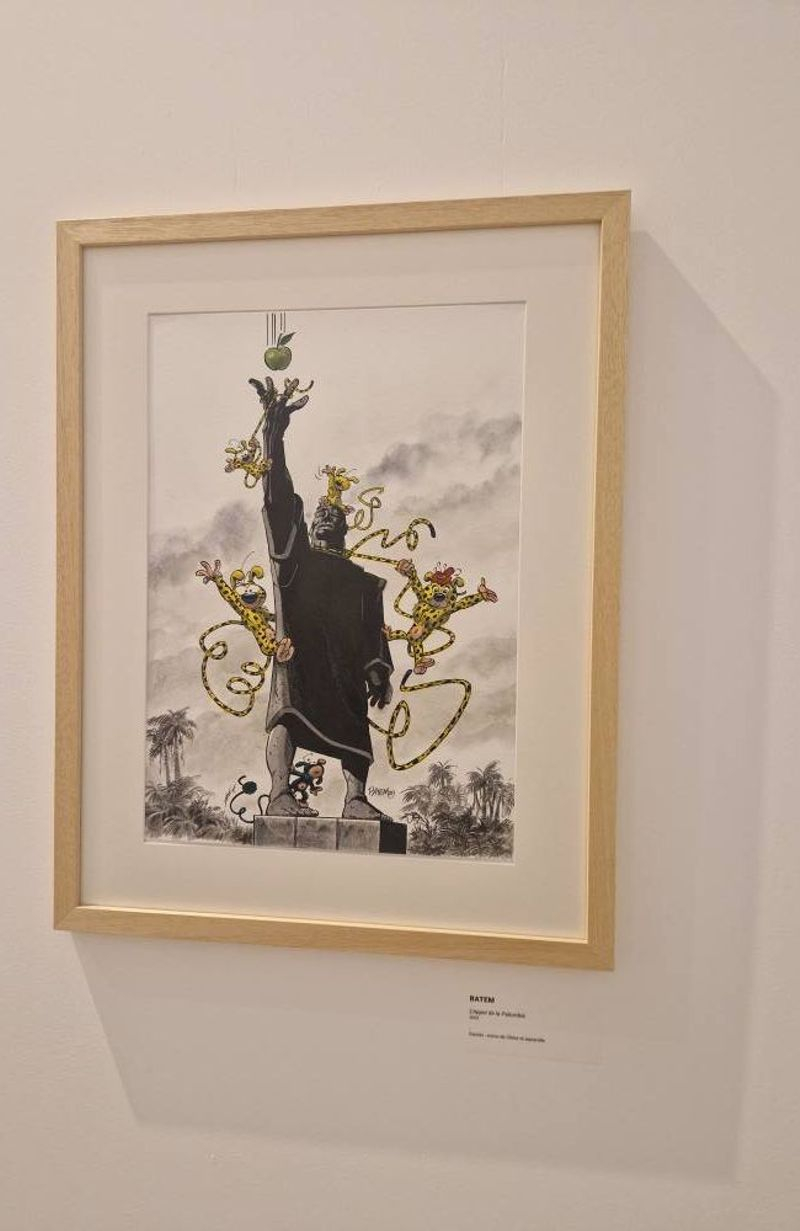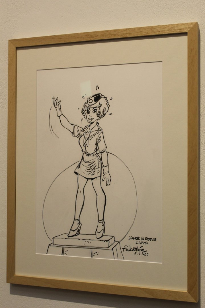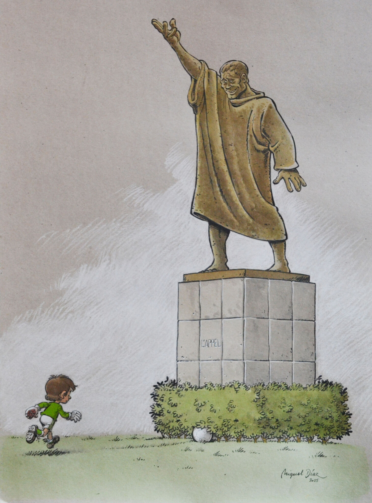 Cette exposition s’ouvre donc par une photographie de « L’Appel », statue au pied de laquelle, enfant, il aimait joué au football, d’où son dessin, réalisé en 2025, alors qu’ayant été approché pour créer une exposition, il ne savait comment remplir les salles du 1er étage du « MiLL », sis dans l’ancien Palais de Justice de La Louvière. Aussi l’idée lui vint de demander à ses collègues dessinateurs de réaliser une illustration autour de cette même statue, due à Ianchelevici.