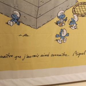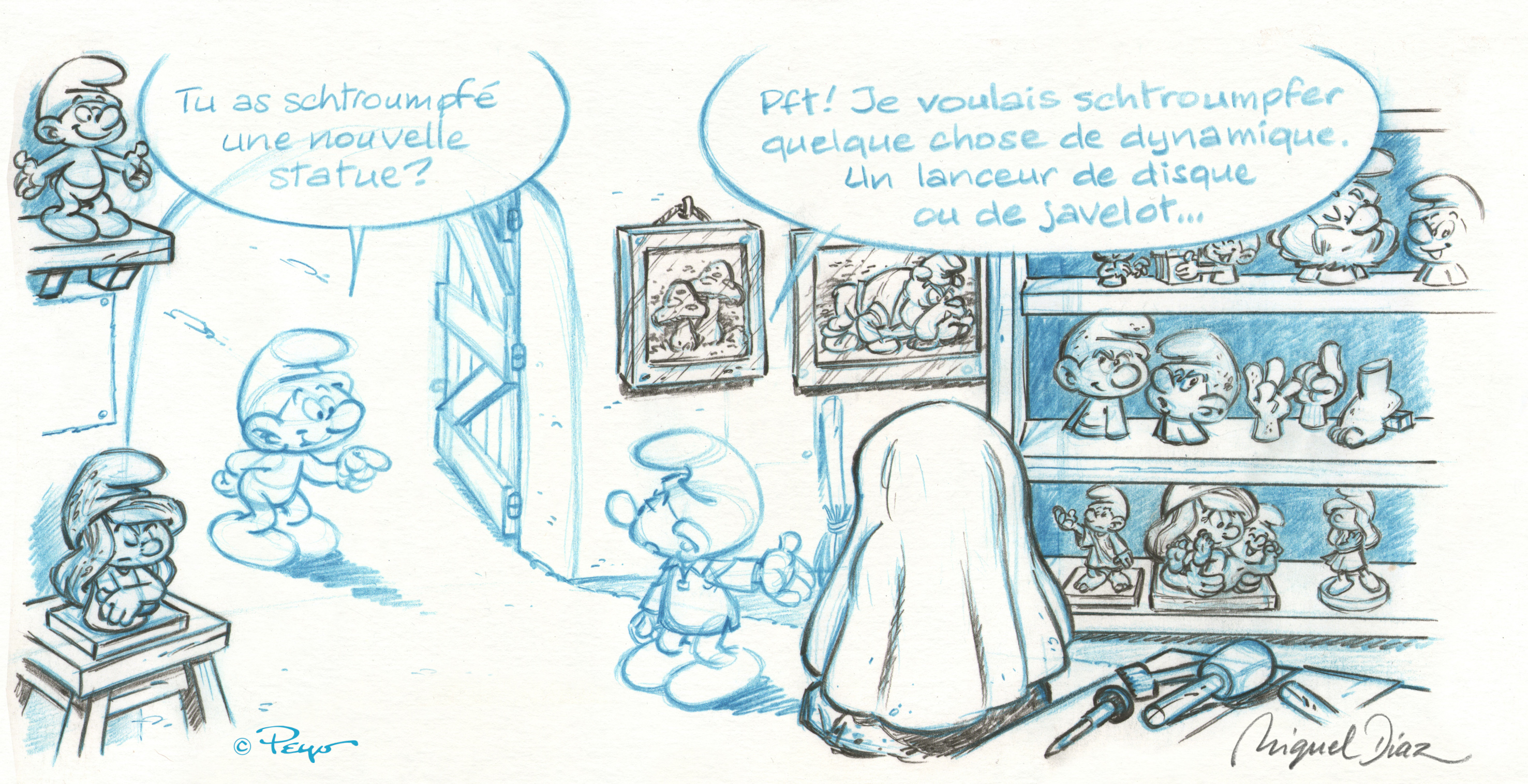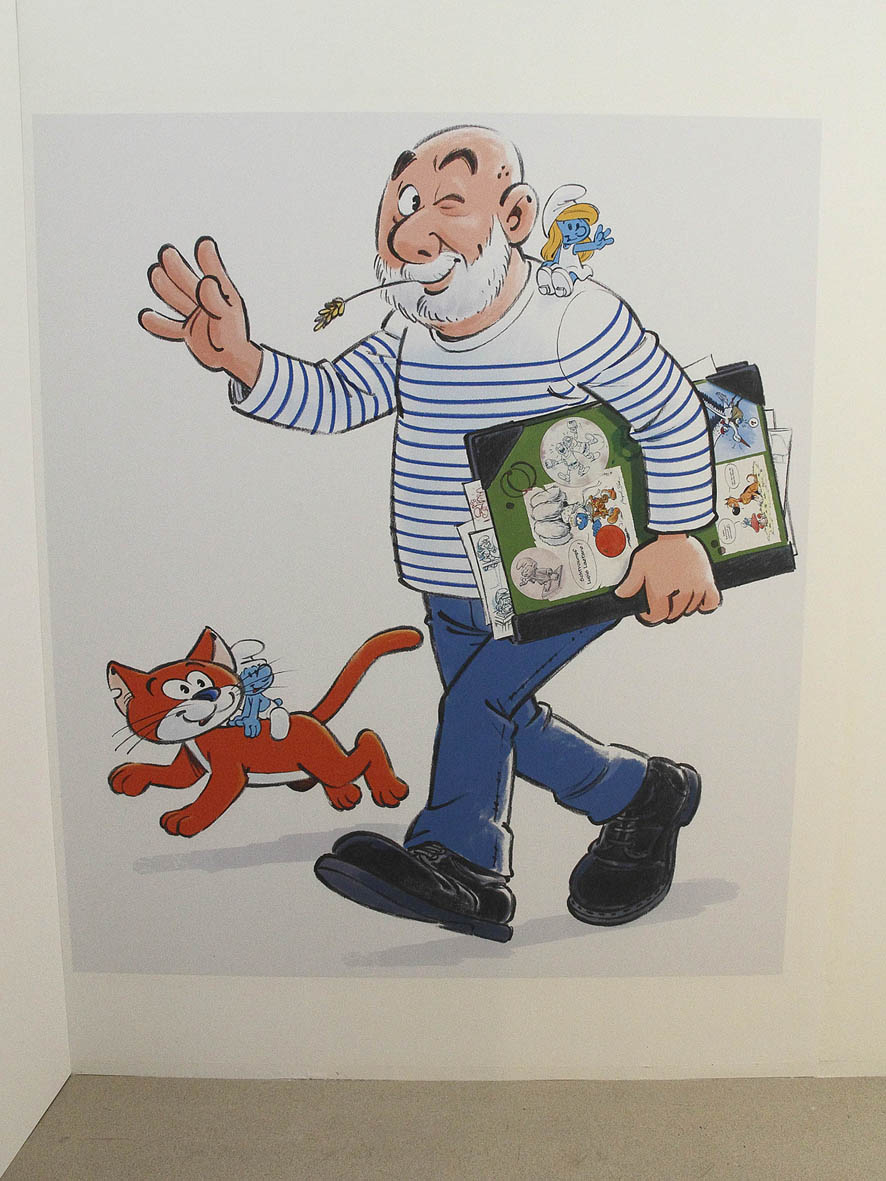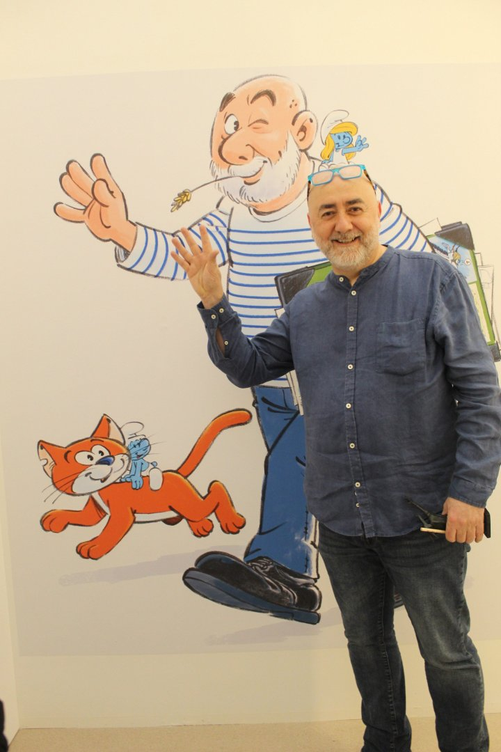 Au sein de la présente exposition, dans un couloir, entre deux salles, Miguel Diaz Vizoso rend hommage, avec nombre de photographies, à Pierre Culliford, qu’il regrette profondément de n’avoir jamais rencontré, ce couloir se terminant par la présentation des albums des « Schtroumpfs » auxquels, il collabora, l’un comme co-scénariste : « Un Enfant chez les Schtroumpfs » (Ed. « Le Lombard »/2007/25è album de la série) ou comme co-dessinateur ou seul dessinateur, pour ce dernier éditeur : « Schtroumpf le Héros » (2015/33è), « Les Schtroumpfs et le demi Génie » (2016/34è), « Les Schtroumpfs et le Dragon du Lac » (2018/36è), « Les Schtroumpfs et la Machine à rêver » (2019/37è), « Les Schtroumpfs et le Vol des Cigognes » (2020/38è/le 1er de 3 aventures comme seul dessinateur), « Les Schtroumpfs et les Enfants perdus » (2022/40è) & « Les Schtroumpfs et la Cape magique » (2024/42è).