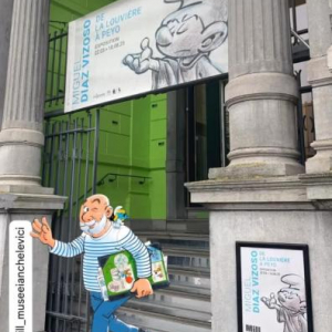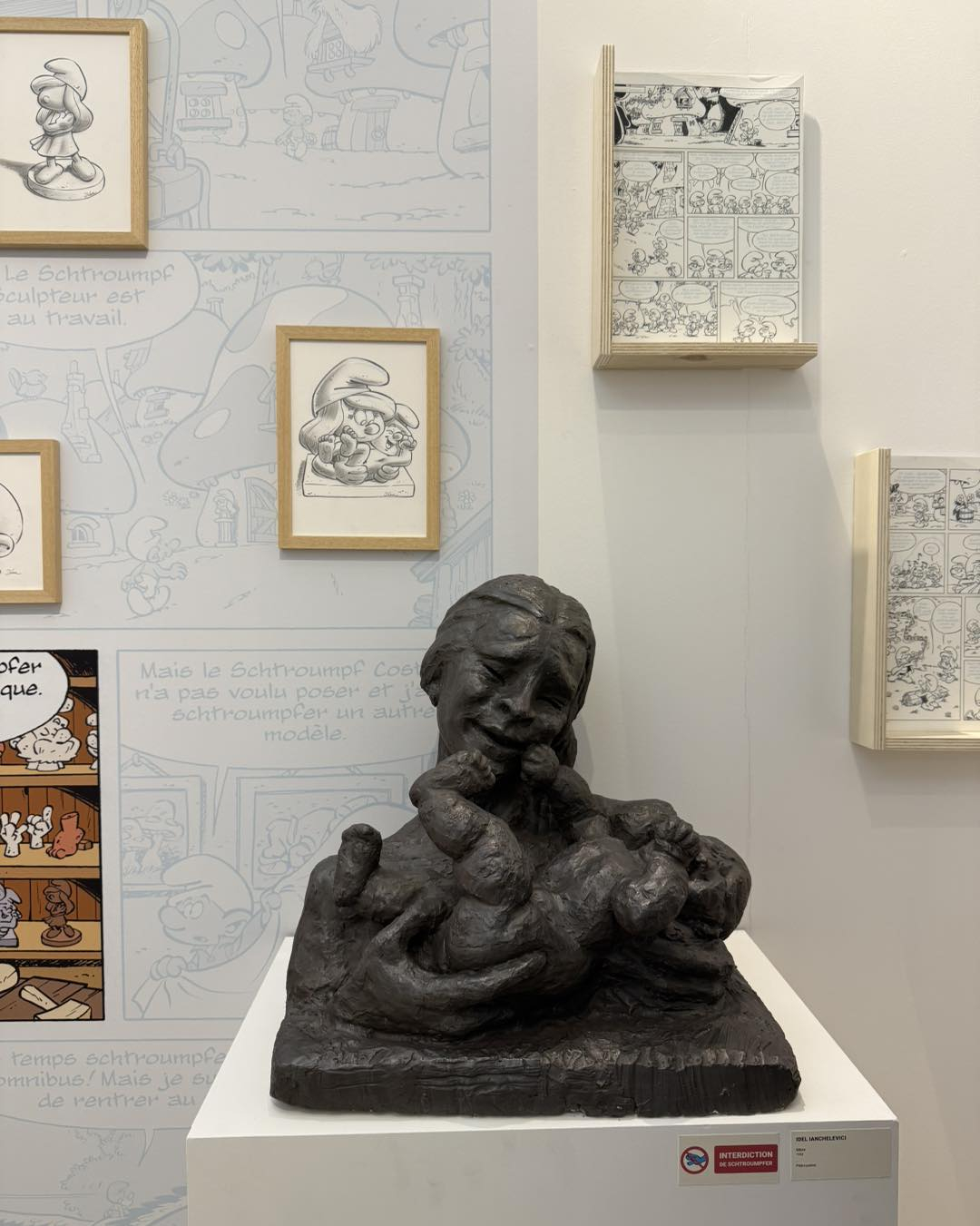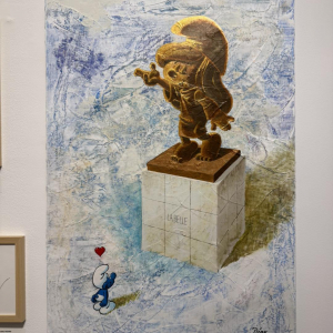 Souhaitant qu’une oeuvre originale, à quatre mains, a été créée pour la présente exposition. Sur une peinture de son ami Riccardo Barattucci (°La Louvière/1973), Miguel Diaz Vizoso ajouta deux dessins, un « Schtoumpf » amoureux admirant « La Belle », une sculpture dessinée de la « Schtroumpfette ».