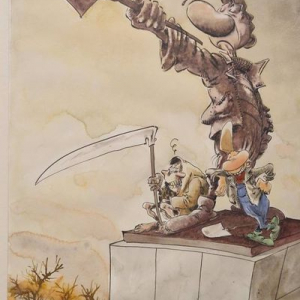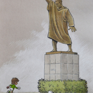 Marqué, moralement quant à lui, par la censure se son album « La Gorgone bleue » (lire les réactions d’une vingtaine de lecteurs sur : https://www.danybd.com/la-gorgone-bleue-dans-la-presse), un autre dessinateur bien connu, créateur, en 1968, d’ « Olivier Rameau », « Dany » (Daniel Henrotin/°Marche-en-Famenne/1943) tint à lui faire parvenir une oeuvre montrant, admirant la statue « L’Appel », « Colombe Tiredaile » demandant : « C’est Diaz ? », « Olivier Rameau » lui répondant : « Non, Miguel n’a pas le bras aussi long ».