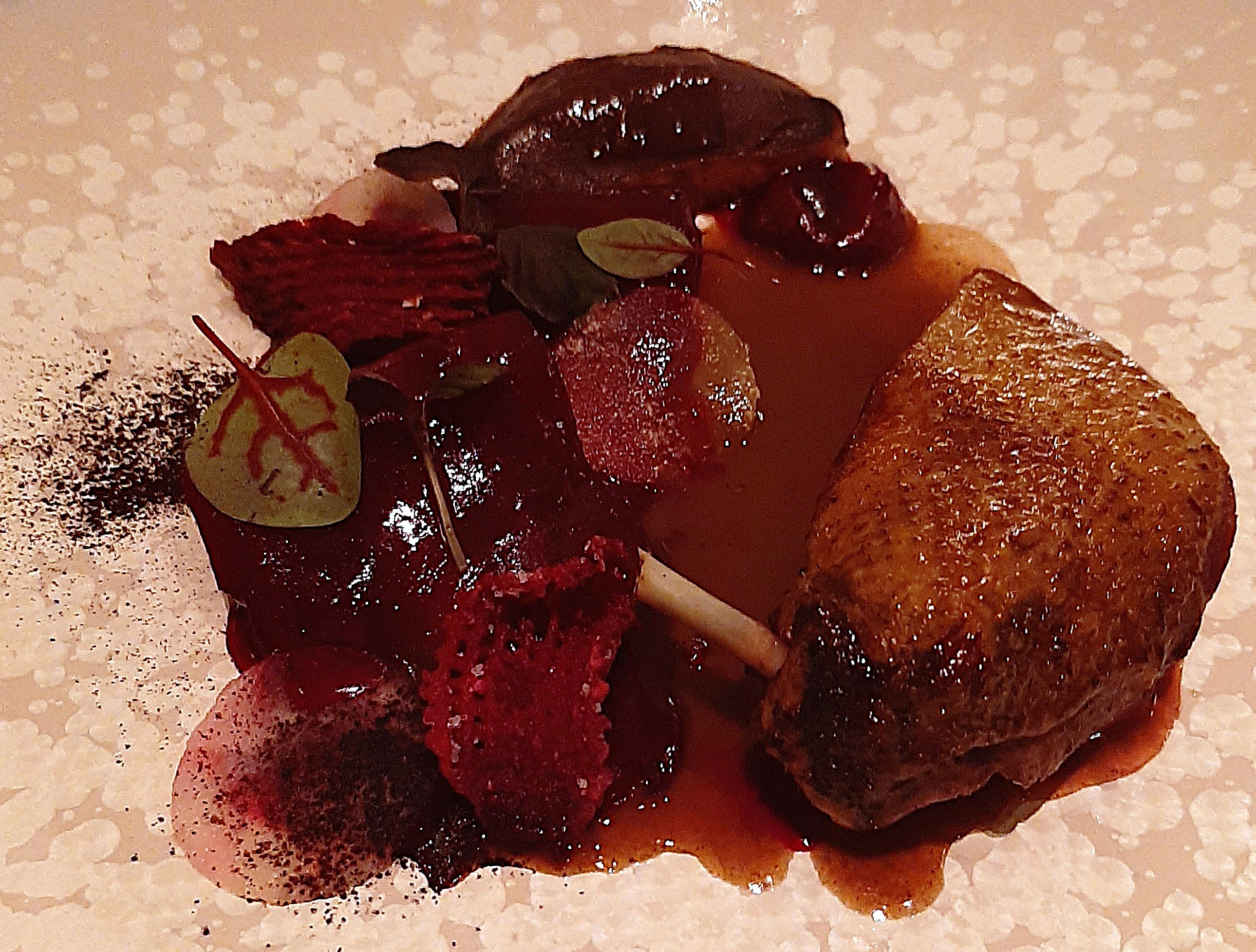 4/ Pigeon des Monts d’Arrée, Laqué-Poudré de réglisse et sa betterave crapaudine, en croûte de foin, sauce salmis,