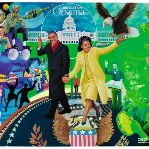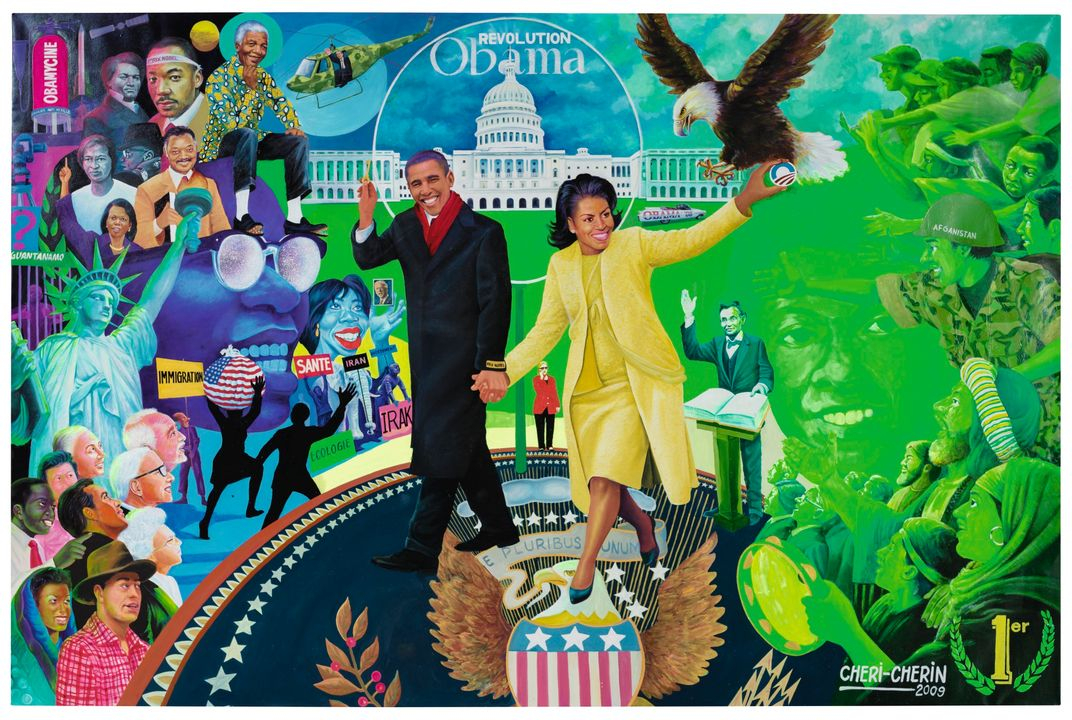 Né, en 1954, à Kinshasa, la capitale de la RDR (République Démocratique du Congo), Chéri Chérin n’hésite pas à s’intéresser à une politique américaine bien différente de l’actuelle, rendant hommage au couple Barack & Michelle Obama, avec un clin d’oeil sur le président américain assassiné Abraham Lincoln, à la base de la suppression de l’esclavage aux Etats-Unis, Nelson Mandela n’étant pas oublié, lui qui mit fin à l’apartheid, en Afrique du Sud.