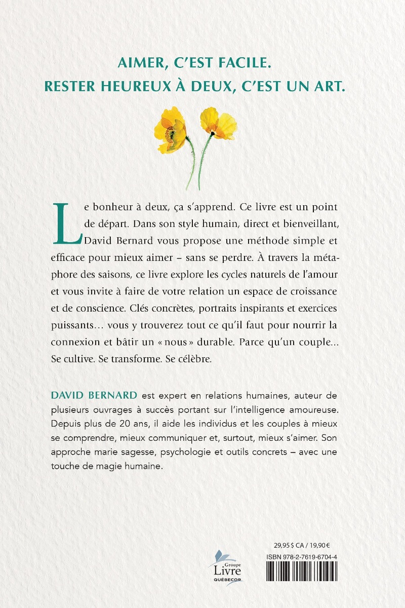 Le bonheur à deux, ça s'apprend. Ce livre est un point de départ. Dans son style humain, direct et bienveillant, David Bernard vous propose une méthode simple et efficace pour mieux aimer – sans se perdre. À travers la métaphore des saisons, ce livre explore les cycles naturels de l'amour et vous invite à faire de votre relation un espace de croissance et de conscience. Clés concrètes, portraits inspirants et exercices puissants... vous y trouverez tout ce qu'il faut pour nourrir la connexion et bâtir un « nous » durable. Parce qu'un couple... Se cultive. Se transforme. Se célèbre.