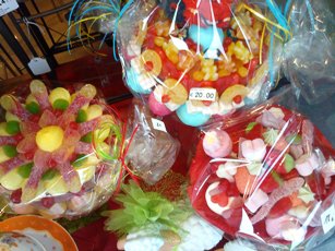 Nous venons d'ajouter à notre gamme de vente les gâteaux et bouquets de confiserie à offrir surtout pour les anniversaires d'enfants. Ils sont réalisés avec différentes friandises . Différentes couleurs sont possibles ainsi différentes figurines comme Mickey, Minnie, Cars,..... De préférence ces articles sont vendus sur commande ( 8 jours suffisent ). Nous en avons cependant toujours en stock.