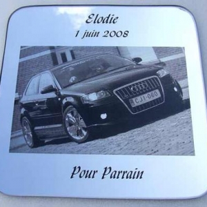 Miroir de 20 sur 20 cm avec gravure photo , texte et support à poser ou support mural pour 49 euros.
