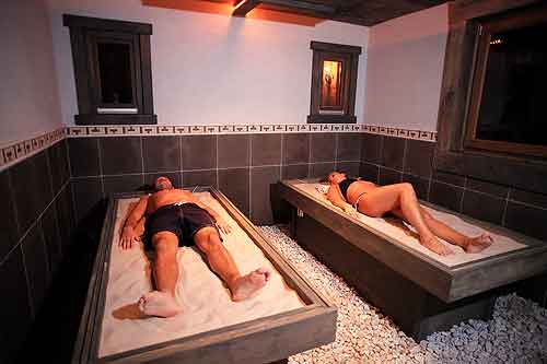 La chaleur douce et sèche du sable de quartz entoure le corps enfoui et s’occupe de procurer une relaxation rapide et intensive sans charge pour le cœur ou les vaisseaux sanguin.