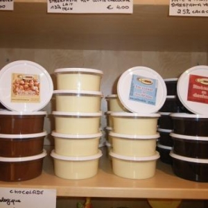 Pâtes à tartiner au chocolat fondant, blanc ou au lait, avec ou sans noisettes.