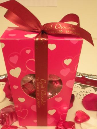 Pralines en forme de cœur, fabriquées artisanalement en nos ateliers et emballées manuellement… avec amour !