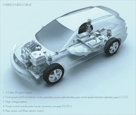 Haute technologie, le concept Hybrid Synergie Drive déjà utilisé sur la Prius trouve sur ce lourd SUV sa meilleure exploitation. Il s’agit de faire travailler ensemble un V6, de 3,3 litres, de 211 cv et deux moteurs électriques. L’un placé à l’avant dans le compartiment moteur, les autres au niveau du train arrière. Le 400h dispose de 272 cv. Mais, cette puissance n’est pas totalement utilisée car les moteurs électriques n’interviennent que de façon ponctuelle et partielle. Mais le moteur électrique joue un rôle primordial lors du démarrage du 400h qui parcourt ainsi les premiers mètres. Le V6 se réveille alors pour fournir l’essentiel de l’énergie. Le plus de ce Lexus est de fournir le meilleur rapport rendement/consommation. A aucun moment vous ne devez viser à préserver la consommation. Tout est automatique grâce à un répartiteur de puissance et à une transmission directe variable en continu en lieu et place d’une boîte de vitesse et d’une lourde transmission. La batterie Nickel-métal hydrure, installée sous les sièges arrière et garantie toute la vie de votre Lexus, se recharge à chaque décélération ou de freinage. Enfin, dans le trafic ou les bouchons le 400h ne fonctionne qu’en mode électrique, autrement dit sans consommer ou polluer. Une véritable avancée vers le véritable véhicule ‘propre’.