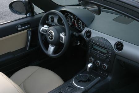 Plus grand, plus rigide, mieux équipé, le roadster Mazda MX-5 de troisième génération ne pèse que 10 kg de plus. La position de conduite de la Mazda MX-5 conviendra maintenant aux 1,90 m et un peu plus, malgré une colonne de direction implantée assez basse. L’habitacle reste traité avec simplicité et sobriété. La planche de bord est abonnée aux plastiques durs, de qualité correcte toutefois. Les ouies de ventilation et la puissance de la soufflante permettent de rouler décapoté même le thermomètre en petite forme. L’instrumentation de bord est lisible malgré la petite taille des cadrans ronds. A défaut d’ordinateur de bord, elle comprend un manomètre d’huile comme dans les sportives du temps jadis.