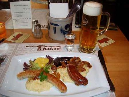 Pour les amateurs de cuisine traditionnelle, le Kartoffel-Restaurant Kiste, à la Fahrstrasse 13-14 – D 54290 Trier, vous enchantera par l’ambiance chaleureuse du personnel ; la patronne Frau Betz, son personnel et le garçon sympa Herr Jäger sont toujours à votre service. Wir haben für Sie ausgesucht, quelques spécialités de la maison : tranche de rôti de porc à la broche (Spiessbraten), servi avec des pommes de terre rissolées, galette de pommes de terre mixée avec de la choucroute, saucisse, compote de pommes et salade (Kappes-Teerdich mit Bratwurst), Leberwurst (boudin de foie), boulettes de pommes de terre farcies de viande hachée sauce Mornay (Trierer Gefüllte). Es war herrlich ! Mit einem grossen Bier oder Weisswein und danach mit einem Kartoffelschnaps, Prost ! A quelque 200 m de la Hauptmarkt, Kiste présente aussi une merveilleuse terrasse (www.kiste-trier.de).