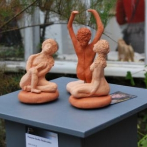 J'utilise plus souvent une couleur ocre, des tons chaleureux, une terre plus ou moins chamotée afin de conserver l'aspect brut de la matière, j'émaille rarement, je patine peu si ce n'est pour ajouter du relief à certaines pièces. Je préfère la sobriété...ce qui m'intéresse c'est de saisir la gestuelle et ce qui s'en dégage. Vous l'aurez compris, l'art figuratif me correspond, les nus, femmes, hommes, seuls ou enlacés.