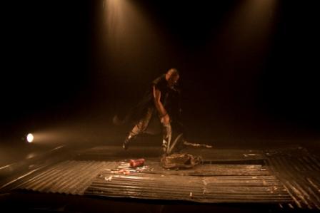 « J’ai cherché quelqu’un qui soit comme un ange dans ce bordel » et venu de là-haut rien que de la flotte de pluie et sur l’ici très-bas des tôles. L’option du metteur en scène liégeois, Luc Jaminet, à l’attention de ce texte de Bernard- Marie Koltès, « La nuit juste avant les forêts »-revendiqué comme sa pièce théâtrale fondatrice- est de construire un personnage naturaliste. Le comédien toulousain, Philippe Cancé, est vêtu comme un loubard, avec treillis, manteau militaire, chaîne et coutelas. Un de ces hommes que tu croises la nuit dans certaines villes, abîmé, seul et blessé, cherchant une chambre. Et croisant au coin d’une rue un autre homme, une présence, peut- être toi, comme ce fut le cas de l’auteur lui- même, Koltès. Sauf que dans la vraie nuit, tu tournes le coin, tu te dépêches, tu fuis. Ici au théâtre, tu restes, tu écoutes et tu entends cet homme- là, devenu guerrier, volontairement en marge, en refus d’aliénation sociale, pétri d’un désir profond de communication avec l’autre. Flot de pluie, flot de paroles fiévreuses et débordantes traduisant le lyrisme sauvage de ce texte. Avec une voix qui alterne étirement jusqu’à plus soif du souffle, cri et cassure rauque. Et dans les trouées de silence des petits gestes rituels, des montées de violence. Des actes isolés, des détresses. C’est qu’il y a une menace physique dans la présence de ce comédien face à nous. Ce soir c’est à nouveau une performance de comédien sous nos yeux, dans une programmation qui décline la radicalité des propositions des artistes. Si les premiers soirs les applaudissements venaient du cœur, ce soir délibérément ils viennent nourris de plus bas. Et si comme le dit une spectatrice : « je ne vais pas dormir cette nuit. », c’est que certains spectacles font rêver et que cette « Nuit juste avant les forêts » a pour fondation de réveiller.