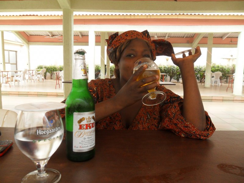 Au bar du Relais du Stade, une collection de verres, autant de délicats ambassadeurs des villes brassicoles belges. On n’y sert que des boissons locales togolaises, bien sûr.