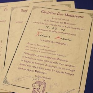 Le nouveau compagnon reçoit son insigne : un gros escargot avec un ruban jaune et bleu qu’il peut pendre au cou et le Grand Mollasson lui déclare : " Je te fait compagnon de la confrérie des Mollassons. " Vient enfin la signature du livre d’or et la remise du diplôme.