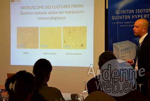 Les 2 produits vedettes des Laboratoires Quinton sont l’Isotonic et l’Hypertonic. Leur application a fait l’objet de plus d’un siècle d’études et de recherches toujours en cours, qui toutes démontrent leur efficacité. Le Dr José Miguel Sempere Ortells, professeur responsable de la Chaire d’Immunologie et Directeur du groupe de Recherche de l’Université d’Alicante, ainsi que le Dr Marc François PAYA, membre de l’Académie des Sciences de New-York, sont intervenus durant ce séminaire pour attester et expliquer aux médecins et nutritionnistes présents, les différentes applications de ces produits, tantôt dans la récupération, tantôt dans la régularisation (bienfaisante) aux niveaux biologique et physiologique du corps humain.