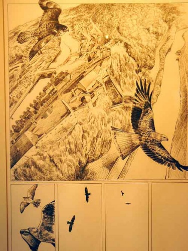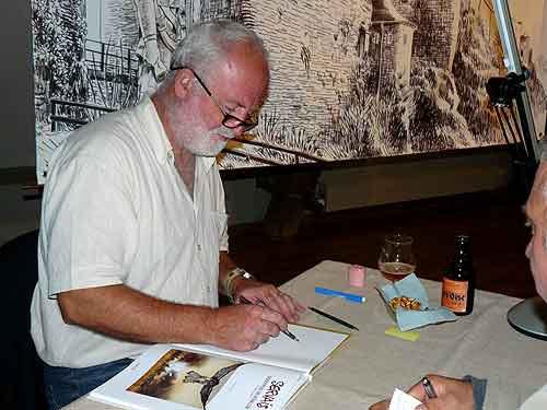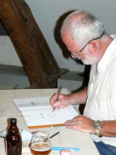 Le dessinateur est installé sur une estrade en fond de salle, occupé à crayonner pour les fans qui se présentent à lui tandis que les autres ont l’occasion de déguster des produits locaux, tel que la « Serv’Oise » en se baladant parmi les esquisses de son dernier ouvrage.