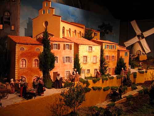 Dès l'entrée de l’expo se succèdent les mas blancs, le moulin, le cabanon, le lavoir, la bergerie, et la bastide. Mais aussi le marché aux étals colorés, les boutiques du boulanger, du potier et du pharmacien. Plus loin un garde-champêtre appelle à l'attention générale, un paysan revient des champs, faux sur l'épaule et s'attarde devant une table où quatre joueurs taquinent la manille, verre de pastis à la main, tandis que le tricheur dissimule une carte sous son séant. Encore un pas plus loin, et c’est une famille qui célèbre Noël, autour de la table familiale recouverte des 13 desserts de Noël.