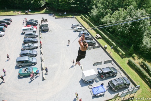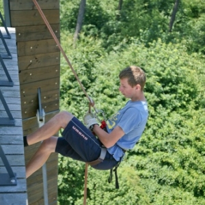 Les uns optent pour l'échelle de cordes, qu'ils graviront pour accéder au premier étage de la tour. D'autres montent simplement les escaliers qui les mèneront au départ de la descente en rappel, ou de la tyrolienne.