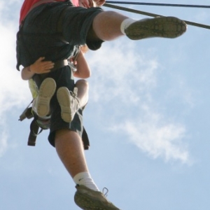 S'il n'y a qu'une quinzaine de mètres de dénivellation, le plancher des vaches, vu de haut, semble être bien loin ! Téméraires, enfants et adultes franchissent le garde-fou, les uns après les autres, bien arrimés au long câble de la tyrolienne, font face au vide et sautent.