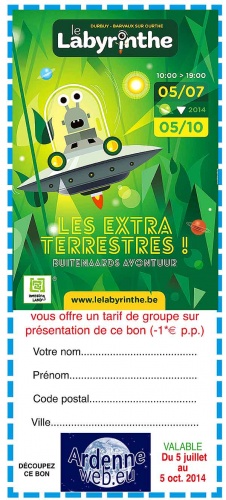 Rejoignez Barvaux-sur-Ourthe, cet été. Venez explorer une nouvelle galaxie dans le Labyrinthe de onze hectares. Vous serez propulsés dans la Labyrinxie, à la rencontre de mystérieux extraterrestres. Dans ce parc à thème verdoyant et 100% nature, des personnages surprenants et des décors étonnants vous emmèneront pour un grand saut vers les étoiles.