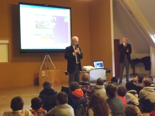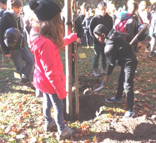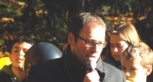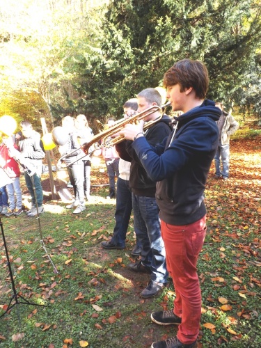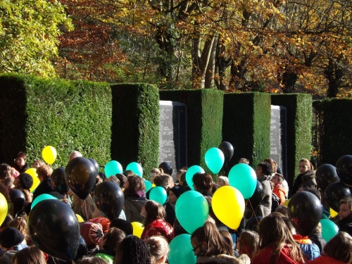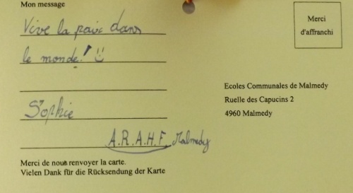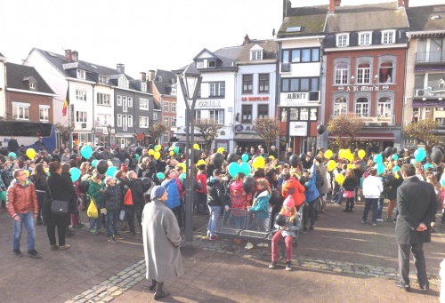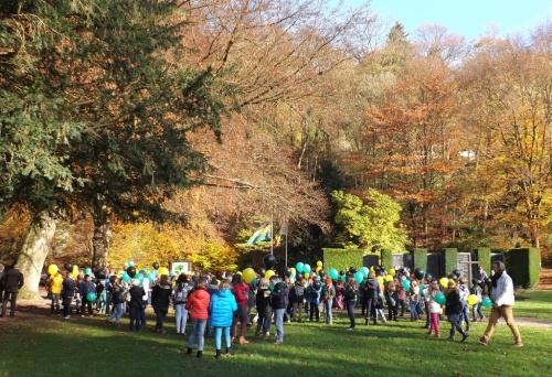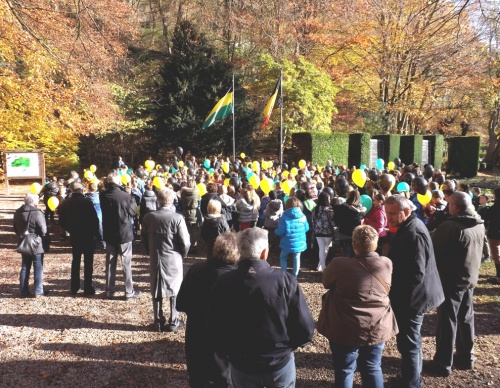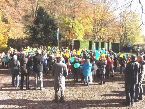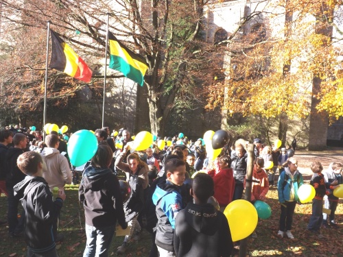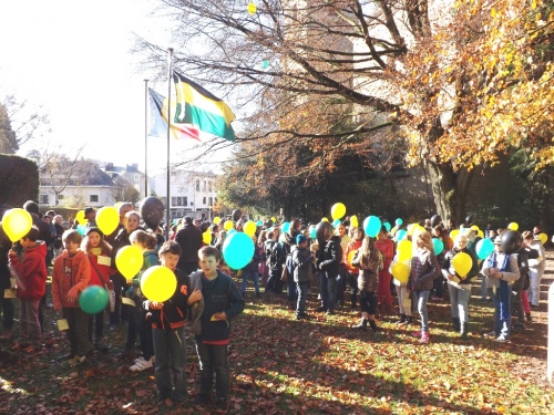 A l’initiative des directions et de leurs enseignants, les élèves des classes des 5ème et 6ème années primaires ont célébré cette commémoration centenaire de manière originale et instructive. Venant de leur établissement respectif, ils se sont retrouvés au Malmundarium en ce lundi 10 novembre, veille de l’Armistice. Les responsables du Club wallon se sont attachés à retracer l’histoire de la Cité depuis ses origines principautaires. Les aléas de son histoire, unique du fait de par son appartenance à la Prusse durant ce premier conflit mondial, méritaient une version officielle faite de projections, de cartes, de commentaires judicieux. Les 300 élèves présents ont perçu ces informations avec grande attention. Au terme de cette séance pédagogique, tous se rendaient ensuite dans le parc de l’abbaye où le bourgmestre les sensibilisait au sacrifice des disparus et à l’absurdité de tels conflits, insistant sur la chance actuelle de vivre dans une suffisance quotidienne et un climat apaisé. A l’issue de ces propos, les élus du Conseil communal des Enfants s’attachaient à planter deux tilleuls, « arbres du souvenir », et la mise en place de la plaque explicative. Le flot des élèves accompagnés de nombreux parents et curieux, gagnaient la place Albert 1er où eut lieu le lâcher de ballons aux couleurs malmédiennes et auxquels étaient attachés des messages de paix rédigés individuellement et qui espèrent une réponse de celui qui découvrira la carte. Le léger vent survenant au moment du lâcher orientait leur envol vers l’Est. Attendons ….