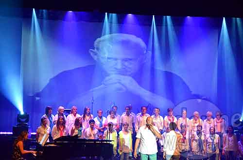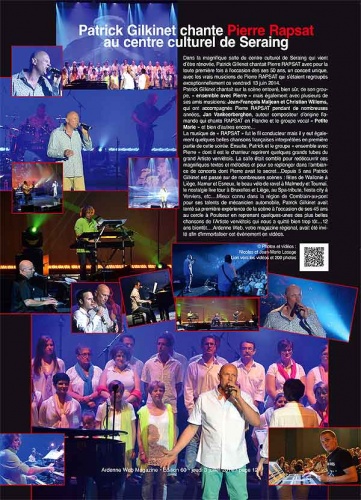 Patrick Gilkinet chantait sur la scène du centre culturel de Seraing entouré, bien sûr, de son groupe, « ensemble avec Pierre » mais également de plusieurs de ses Amis musiciens: Jean-François Maljean, Christian Boissart et Christian Willems, qui ont accompagnés Pierre RAPSAT pendant de nombreuses années, Jan Vankeerberghen , auteur compositeur d’origine flamande qui chante RAPSAT en Flandre et le groupe vocal « petite Marie » et bien d’autres encore…