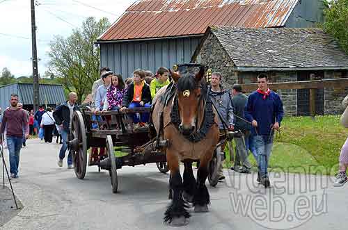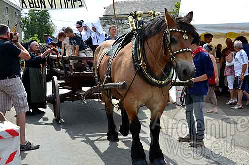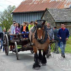 Des chars à bancs débordants d’enfants menés par de lourds chevaux ardennais aux cuivres étincelants.