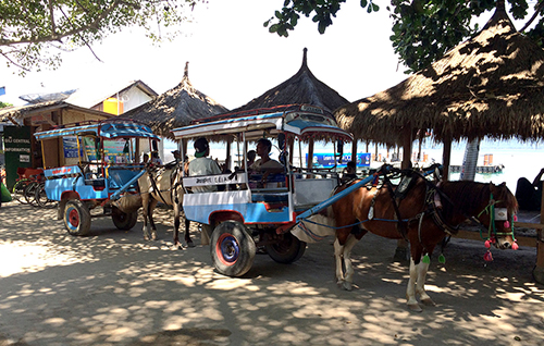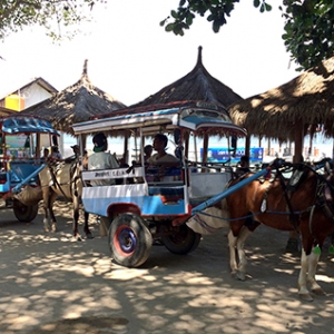 Les véhicules à moteurs sont inexistants sur Gili Air, on s’y déplace principalement en vélo (loués par les locaux) ou en cidomo (petite calèche tirée par un poney).