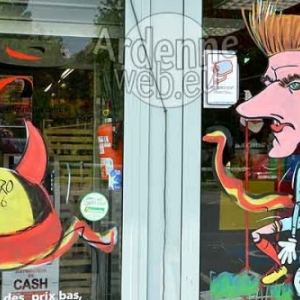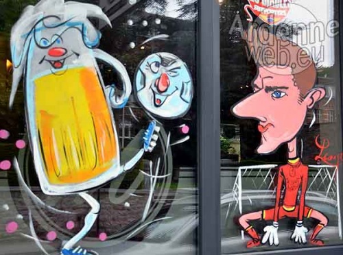 A l'occasion de l'Euro 2016 de nombreux commerçants soutiennent les Diables rouges en offrant sur leur vitrine la caricature de leur joueur préféré.