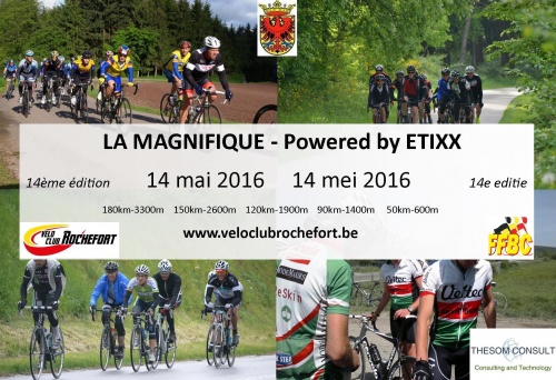 La Magnifique, le 14 mai à Rochefort, c’est le rendez-vous incontournable pour les cyclos. Cette randonnée parcourt les splendides paysages de la Famenne et de l'Ardenne à partir de Rochefort. La Magnifique est intégrée, cette année, au Challenge ETIXX 2016. Cinq parcours sont proposés, dont quatre sont repris au Challenge des Montagnardes de la FFBC. Les parcours 2016 sont nouveaux, combinant les itinéraires historiques et les circuits des deux dernières années, avec de nouvelles côtes et de belles surprises. Vingt et une côtes principales sont répertoriées sur le grand parcours. Sur chaque trajet, au bas de chaque côte, figure un panneau informatif avec la distance, la pente maximale et la pente moyenne. Les ravitaillements sont nombreux et variés (180 km et 150 km : 3 ravitaillements; 120 km : 2 ravitaillements; 90 km et 50 km : 1 ravitaillement).