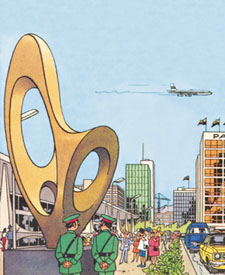 ... Mais de l'art primitif et du mythique 2ème album des "Aventures de Tintin", passons à l'art moderne et au dernier album achevé, publié en couleurs, avec, sous une vitre, une petite sculpture de sa collection, qu' "Hergé" transforma en un tout grand monument décorant une case de "Tintin et les Picaros", celle-ci se retrouvant aux côtés la dite sculpture.