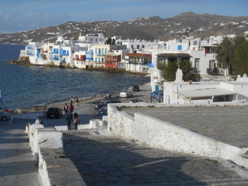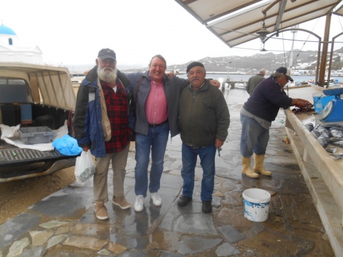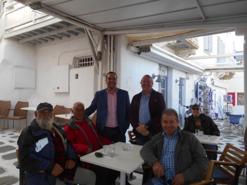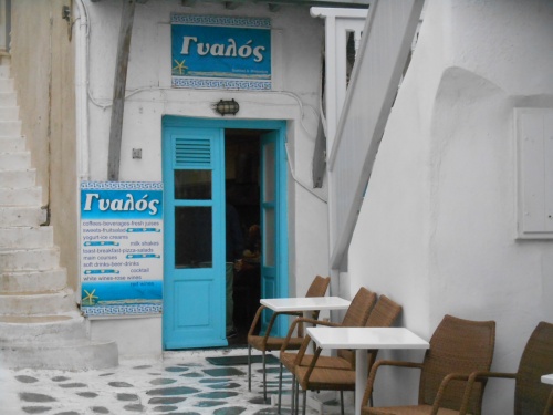 Au café et snack Yialos, chez Vassiliki (fille et grand-mère) et Mina (maman), ouvert à cette période de l’année, les autochtones nous font signe ; c’est tout à fait différent de l’été et de la haute saison touristique. Voilà l'endroit idéal et moins cher pour déguster une bonne bière Mythos, un petit café grec ou encore déguster les calamares frits, les keftedes (boulettes de viande hachée préparées avec du pain, des oignons et sans aïl), les souvlakis (brochettes de porc ou de poulet) et autres spécialités maison. Yialos reste le lieu rêvé pour rencontrer les vrais Mykoniates et peut-être aussi le jeune et sympathique maire Konstantinos Koukas.