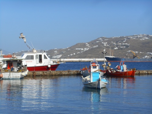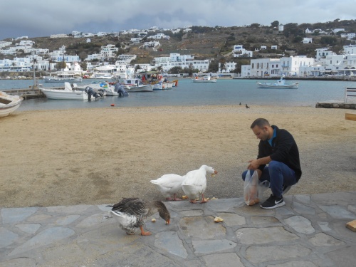 En novembre, le ciel est très lumineux et l’île respire la tranquillité. Le calme apporte une sensation bienfaisante, les Grecs discutent volontiers avec la dizaine de touristes présents dans le port. Pétros, le pélican vedette et mascotte de Mykonos, se laisse un peu caresser, dans une des nombreuses ruelles de Chora. A chaque passage dans le port, l’on reconnaît quelques pêcheurs, tels que Yianis et Panayis.