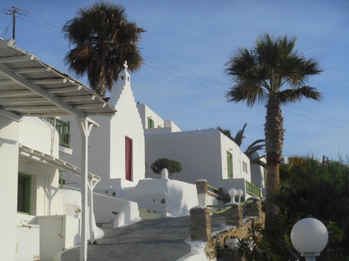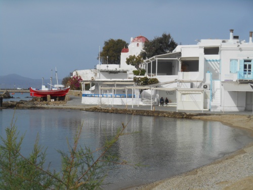 L'Hôtel Mykonos Beach***situé à Megali Amos, à quelque 5 minutes en voiture des moulins et à 7 minutes du port de Mykonos, est à conseiller pour ses petits maisons blanches, son accueil agréable avec Eva et Alex et la vue sur la mer Egée. Un moment bien agréable après les visites. Goûtez les calamares avec tzatziki et la retsina Malamatina.