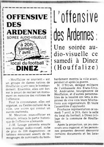 Une présentation suivit le samedi 7 avril 1984 à 20h dans la salle de Diner ( village de la commune de Houffalize), avec à chaque fois, après la projection, un jeu concours afin de découvrir avec les personnes présentes certains documents afin de les localiser.