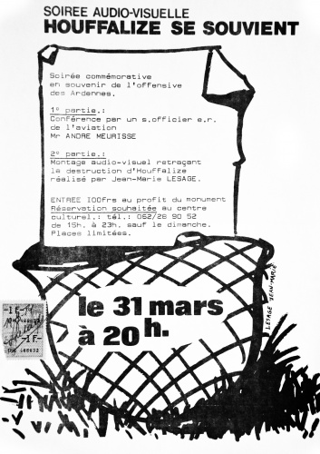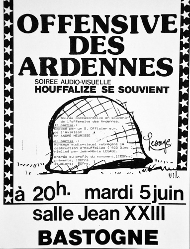 Houffalize se souvient 1944/1945 • Vidéo de 55 minute publiée et modifiée de 1980 à 1985. Cette vidéo a été réalisée par Jean-Marie Lesage et Benoit Heuse grâce à la collaboration bénévole de Véronique Baccus, de Mr Meurisse, Mr Cavanagh, Mr Caprasse, du Lieutenant Colonel Guy WEBER, des reporters US Army et de Charles B. Mac Donald etc..