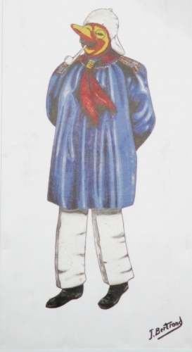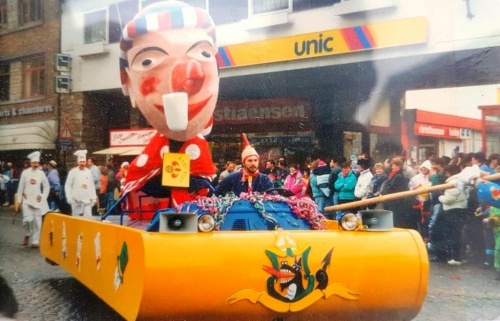 - D’où provient cette reproduction « grande échelle » de ce masque local ? L’enquête rapportée par Bruno Querinjean, permet de découvrir quelques étapes de sa vie. Cette tête qui faisait partie d’un char de la Royale Malmédienne, est sortie pour la première fois en 1964, il y a donc 55 ans ! (voir ce film de 1964 : https://www.facebook.com/bruno.querinjean/videos/10218365902208758/ ). Par la suite, elle fut utilisée à plusieurs reprises lors du cortège des enfants du 1er jeudi gras. Et durant des années, elle est restée suspendue au plafond des hangars de la Royale Malmédienne ( entre autre à la caserne). En 1983, lorsque la Royale Malmédienne a bénéficié d’un nouveau local pour ses rangements, l’espace disponible ne lui permettait pas de conserver cet « objet » encombrant qui prit la direction des ateliers communaux. En 1991, un groupe carnavalisant dont le thème traitait des « masques traditionnels », lui permit de prendre l’air à l’occasion du cortège du dimanche (voir photo ). Depuis, elle est vraisemblablement retournée dans les poussières communales. Comme le suggère l’enquêteur cité plus avant, « on ne peut que lui souhaiter de nombreux allers - retours de l'ombre à la lumière pendant des années encore afin que chaque génération puisse en profiter comme nous en avons profité. Félicitations et merci à ceux qui on eut l'idée, la motivation et l'enthousiasme de la remettre à neuf dans son état quasi d'origine et de nous la présenter en 2019... »