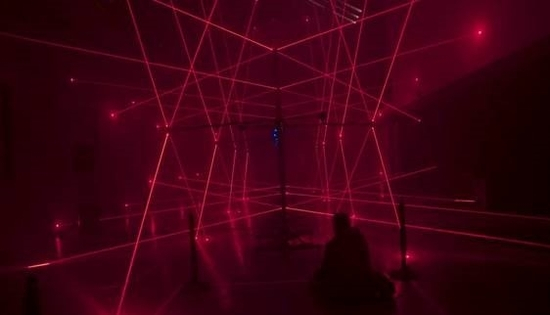 ** « Atarexie », signifiant « Paix de l’Esprit », dans une salle de gymnastique de l’ « Institut Saint-Louis », est une installation lumineuse de l’artiste français Maxime Houot, qui n’est exposée que pour la seconde fois, après l’avoir été au « Sonica Festival », à Glasgow. Oeuvre majeure de cette 11è édition, elle se compose de 15 bras mécaniques–balanciers motorisés, qui, chacun, comportent 4 faisceaux lasers, se mouvant au gré d’une chorégraphie de 20 minutes, comportant plusieurs tableaux, des faisceaux de lumière rouge se transformant en structures géométriques de plus en plus complexes remplissant tout l’espace du lieu.