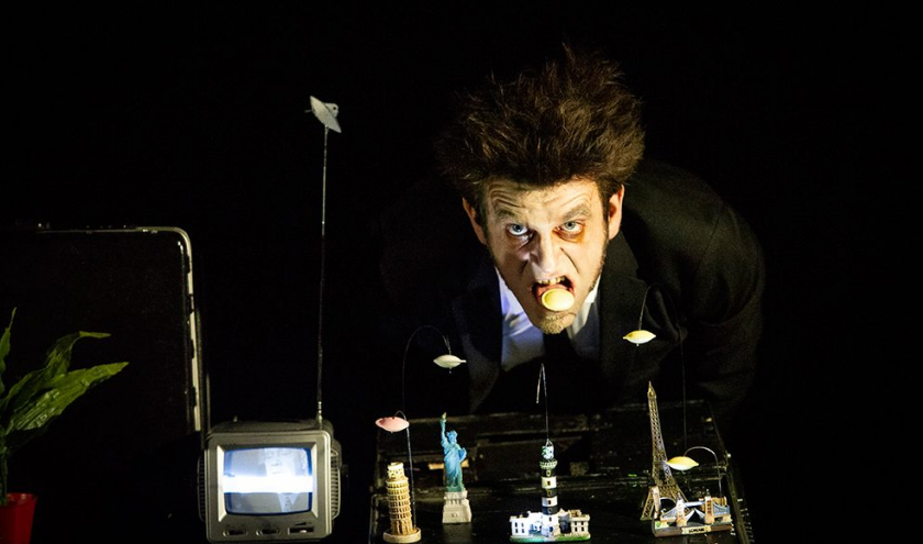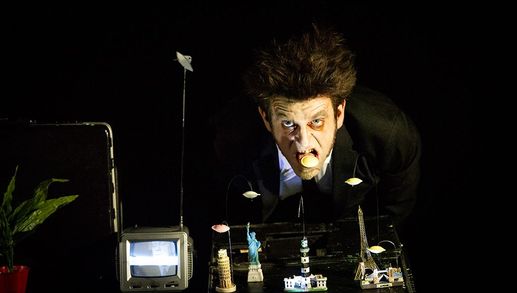 Largement inspiré des films de science-fiction des années ’50, ce spectacle de théâtre d’objets sur table – présenté par un inquiétant personnage, aux gants de plastique fluo, mi-démiurge, mi-croquemort – est un moment pour jouer à se faire peur et où, en même temps, tout prête à sourire, grâce à un esprit de dérision omniprésent.