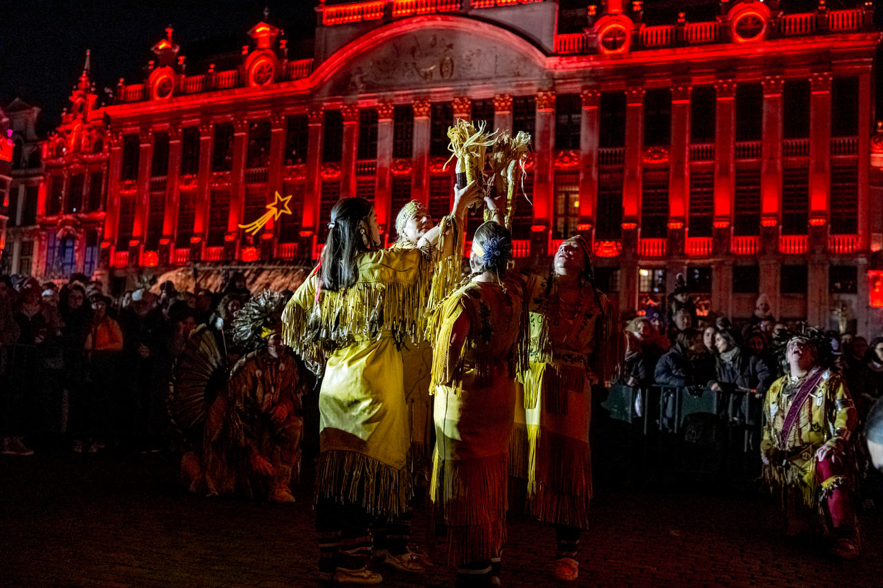 Quelques-un.e.s de leurs chanteurs, danseurs et musiciens, femmes et hommes, égayèrent la première semaine des « Plaisirs d’Hiver », notamment à l’occasion de leur ouverture, sur la Grand’ Place, le vendredi 24 novembre, un de leurs artisans fabriquant à la main, un canoë traditionnel – jour après jour, jusqu’à la fin décembre – face à « La Bourse », rue Auguste Orts, sous une longue tente historique « Shaputuan », que 8 familles d’amérindiens québécois partagèrent autrefois. Alors que, sous cette tente ou devant des chalets voisins, nous pouvons découvrir l’artisanat de ces peuples et goûter à leurs spécialités culinaires. Libre à nous d’acquérir l’un ou l’autre de leurs produits (épices du guerrier, tisanes boréales, mocassins, pagaies « Onquata », bières de la microbrasserie "Kahnawak", café boréal à l’érable, sauce piquante « La Scorbut », sel aux champignons sauvages, café boréal à l’érable, autres produits à l’érable, …) et d’aller à la rencontre de cet artisan autochtone, … son canoë, créé face à « La Bourse », étant destiné à être offert à la Ville de Bruxelles.