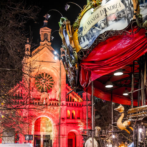 Soulignons la présence de deux superbes carrousels, ouverts de 12h à 22h. D’abord, sur la place Sainte-Catherine , accessible jusqu’au samedi 31 décembre, le « Manège d’Andréa », aux personnages fantastiques, réalisés à la main, dans l’univers poétique de Jules Verne (1828-1905).
